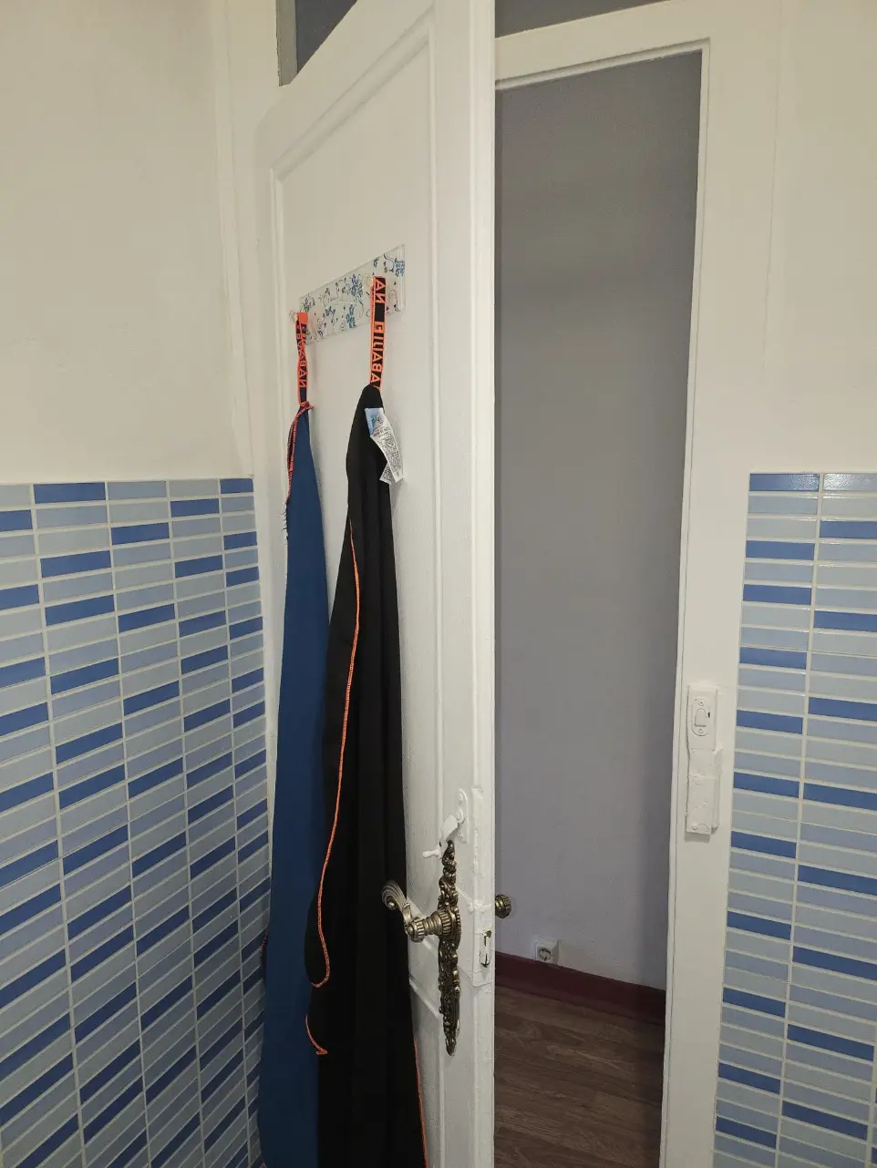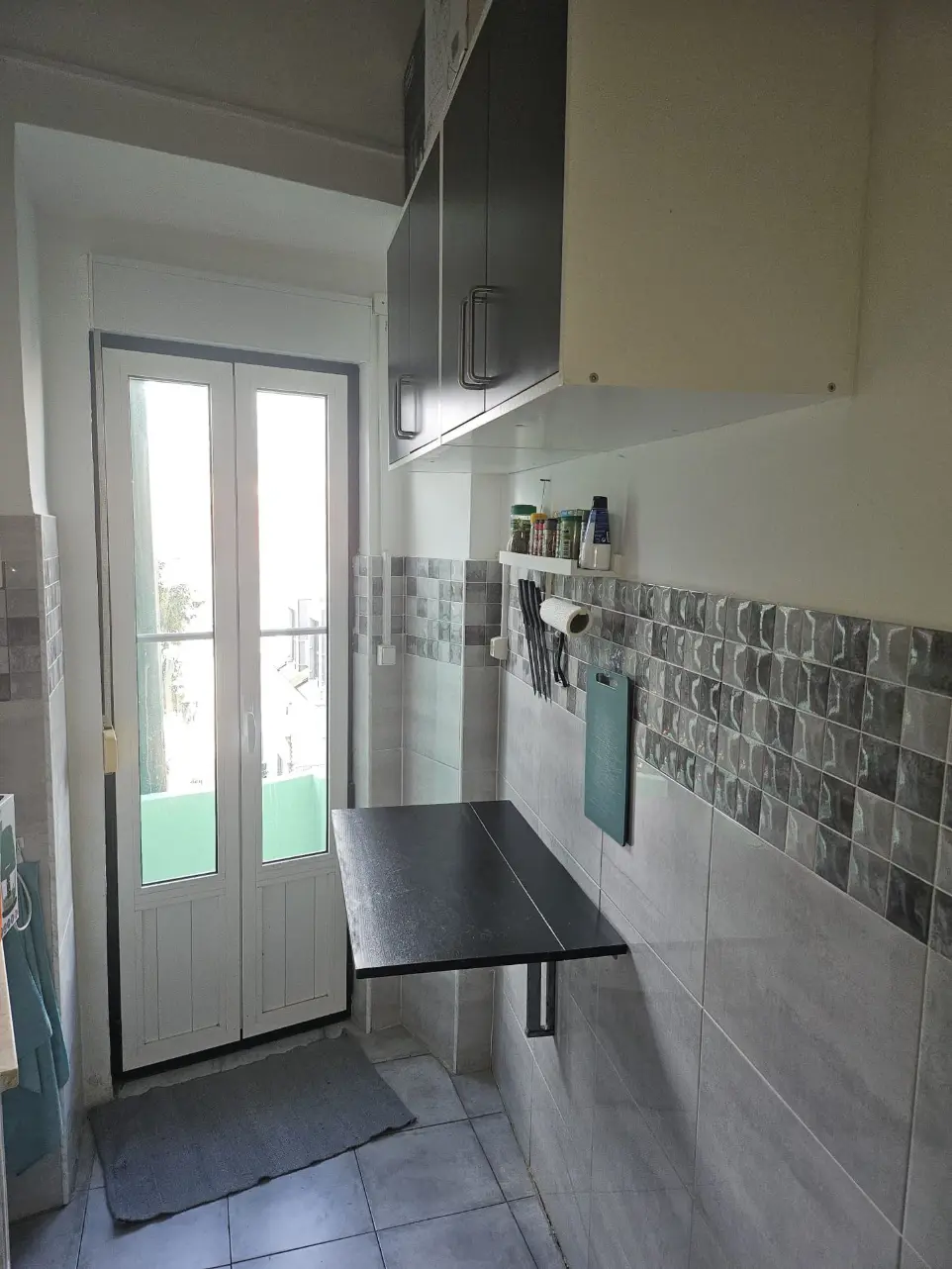 Derrière la double porte vitrée qui donne sur la terrasse, se trouve, en annexe une machine à laver ainsi que tout le nécessaire pour nettoyer l'appartement.
