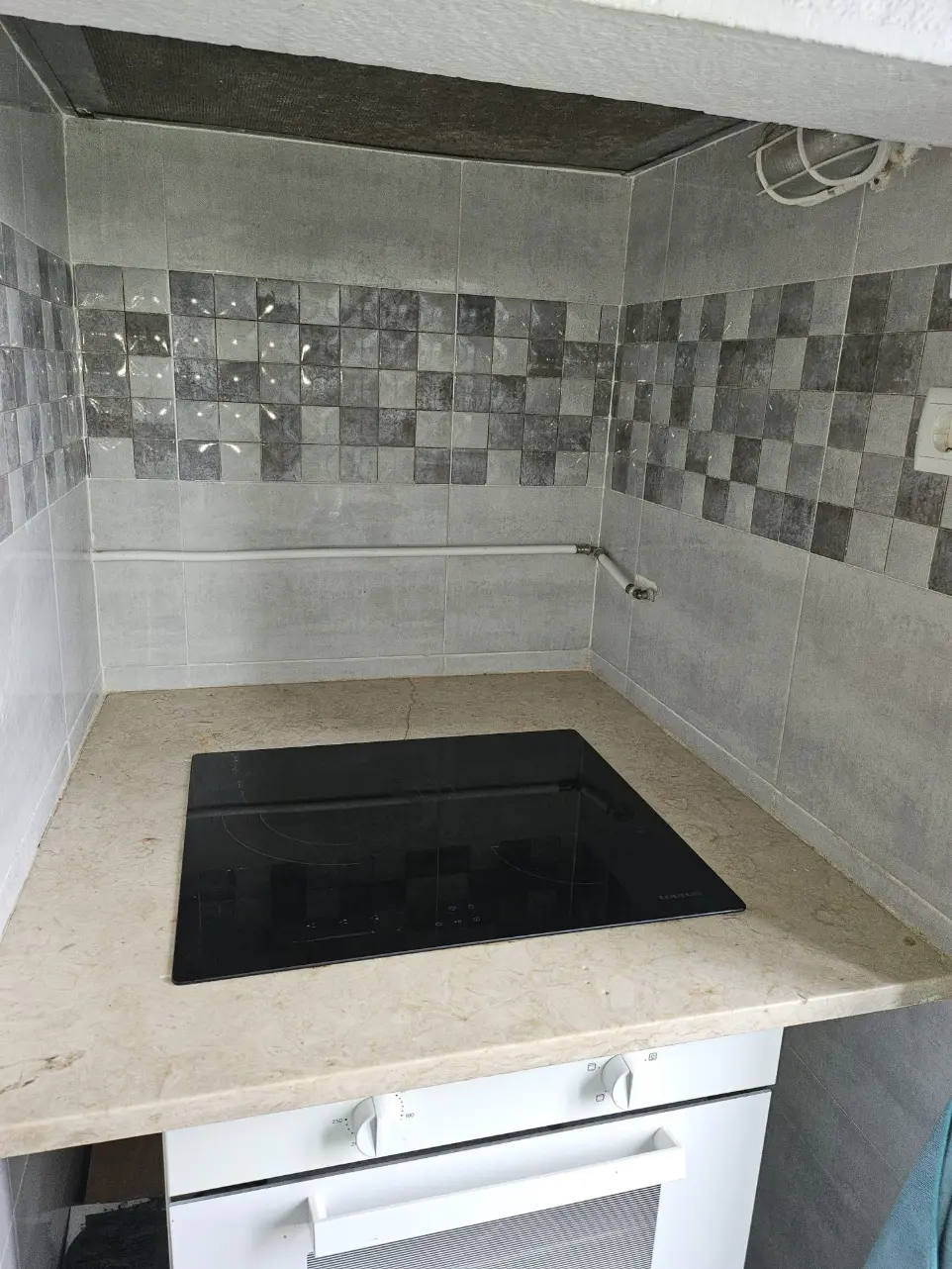 La cuisine dispose d'un évier en inox, de placards de rangement (vaisselle, produits d'entretien). Elle dispose aussi d'une plaque à Halogène, d'un four électrique, d'un extracteur d'air ainsi que d'un plan de travail pour faire à manger et éventuellement y prendre ses repas (bien que la salle à manger soit plus adaptée). A noter : il n'y a pas de lave-vaisselle.